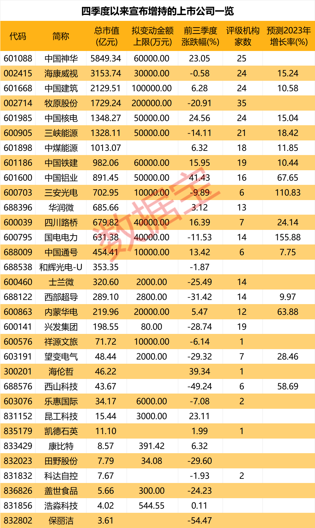 行情方面,牧原股份、士兰微、兴发集团、西部超导等股前三季度股价下跌超过20%,股东增持的利好效果或许更为显著。业绩方面,根据5家以上机构一致预测,国电电力、三安光电2023年净利润翻倍,中国铝业、内蒙华电和西山科技净利润增幅超过50%。