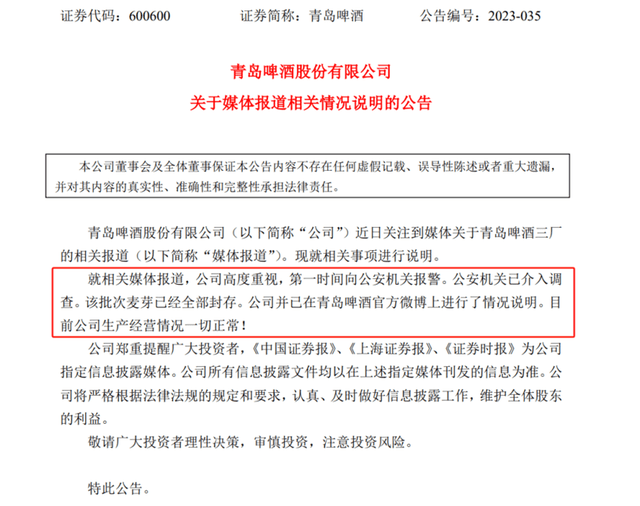 10月23日早间,青岛啤酒再次发布公告称,公司近日关注到媒体关于青岛啤酒三厂的相关报道。现就相关事项进行说明。就相关媒体报道,公司高度重视,第一时间向公安机关报警。公安机关已介入调查。该批次麦芽已经全部封存。公司并已在青岛啤酒官方微博上进行了情况说明。目前公司生产经营情况一切正常。