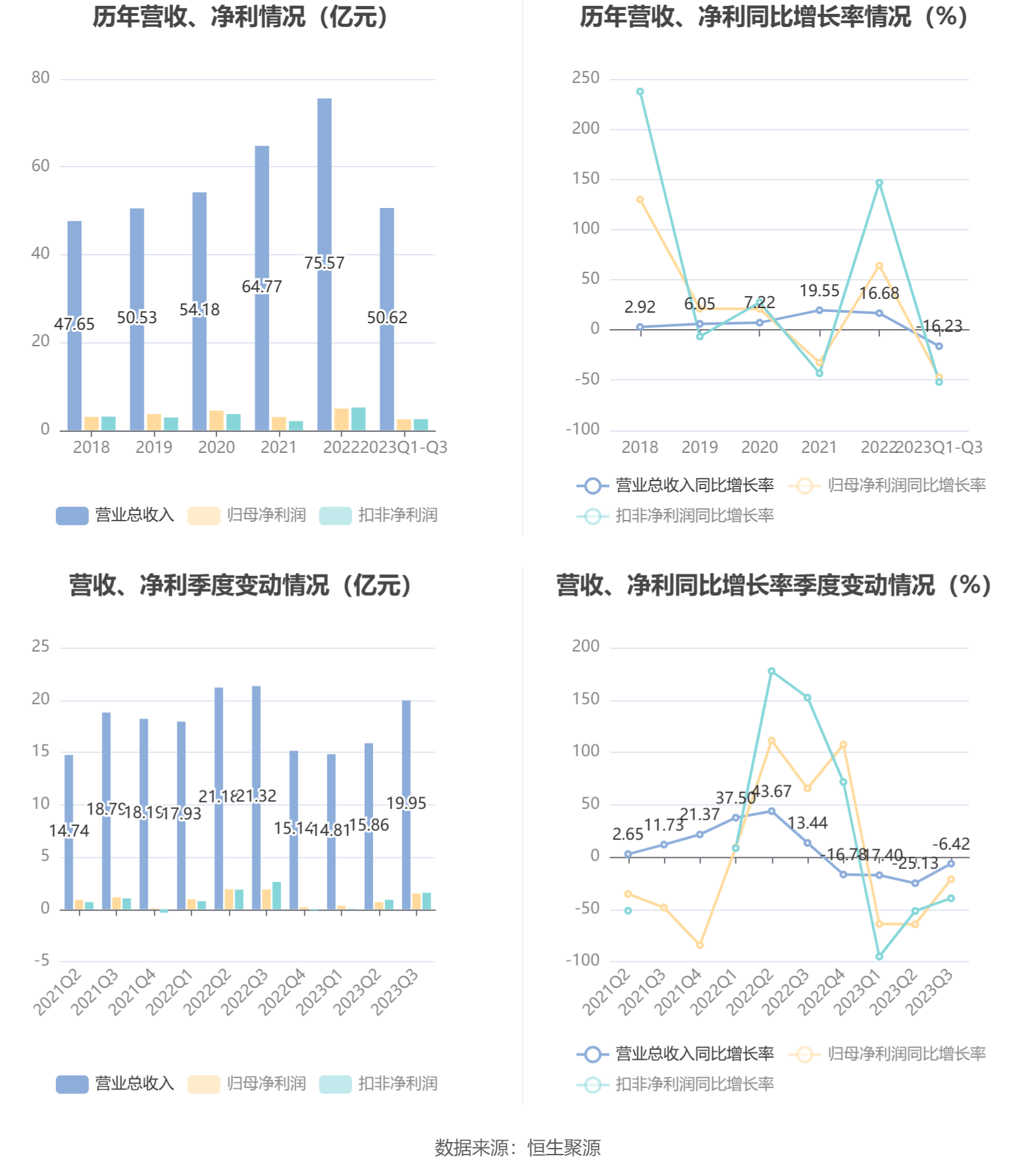 根据三季报,公司第三季度实现营业总收入19.95亿元,同比下降6.42%,环比增长25.80%;归母净利润1.49亿元,同比下降21.38%,环比增长118.89%;扣非净利润1.58亿元,同比下降39.56%,环比增长73.67%。