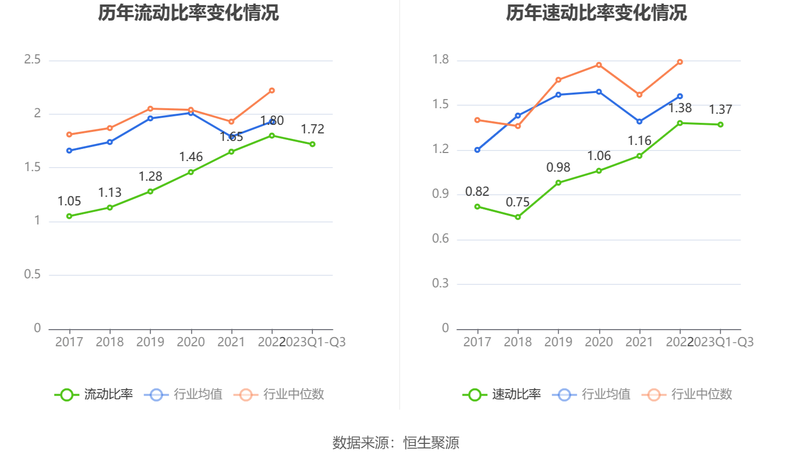 2023年前三季度,公司流动比率为1.72,速动比率为1.37。
