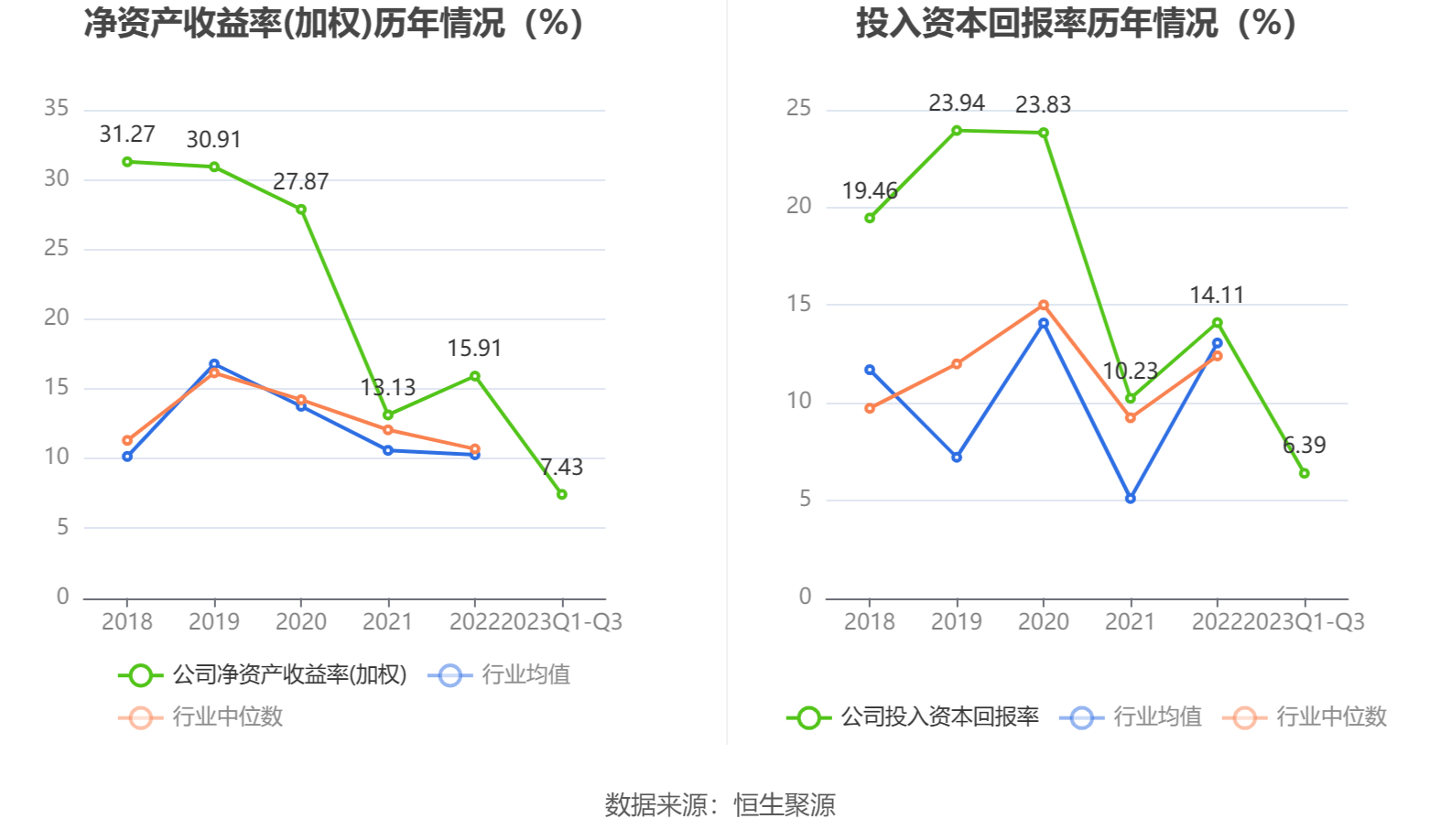 数据显示,2023年前三季度公司加权平均净资产收益率为7.43%,较上年同期下降7.90个百分点;公司2023年前三季度投入资本回报率为6.39%,较上年同期下降7.19个百分点。