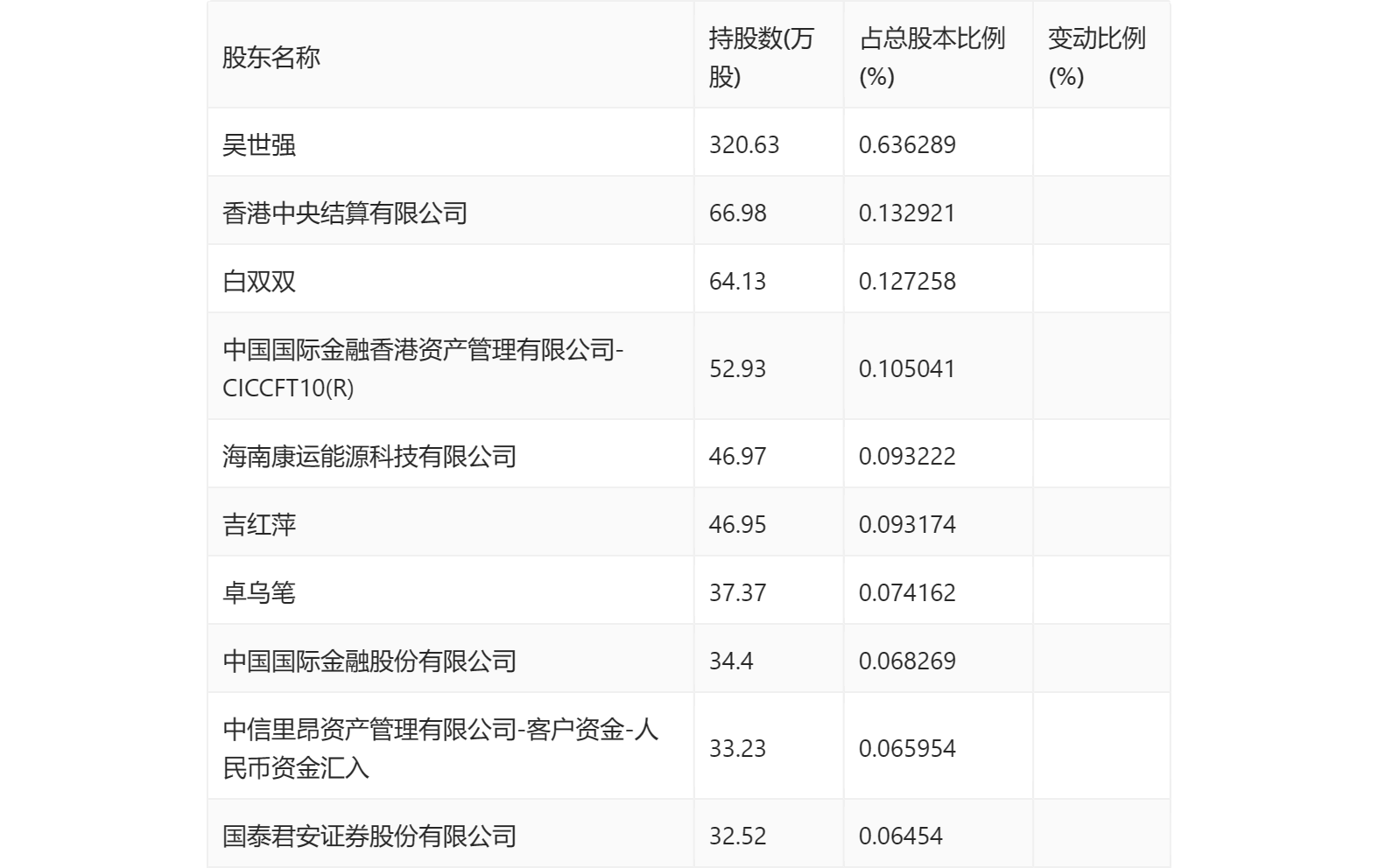 三季报显示,2023年三季度末公司十大流通股东中,新进股东为中国国际金融香港资产管理有限公司-CICCFT10(R)、海南康运能源科技有限公司、吉红萍、中国国际金融股份有限公司、中信里昂资产管理有限公司-客户资金-人民币资金汇入、国泰君安证券股份有限公司。在具体持股比例上,香港中央结算有限公司持股有所上升,吴世强、白双双、卓乌笔持股有所下降。