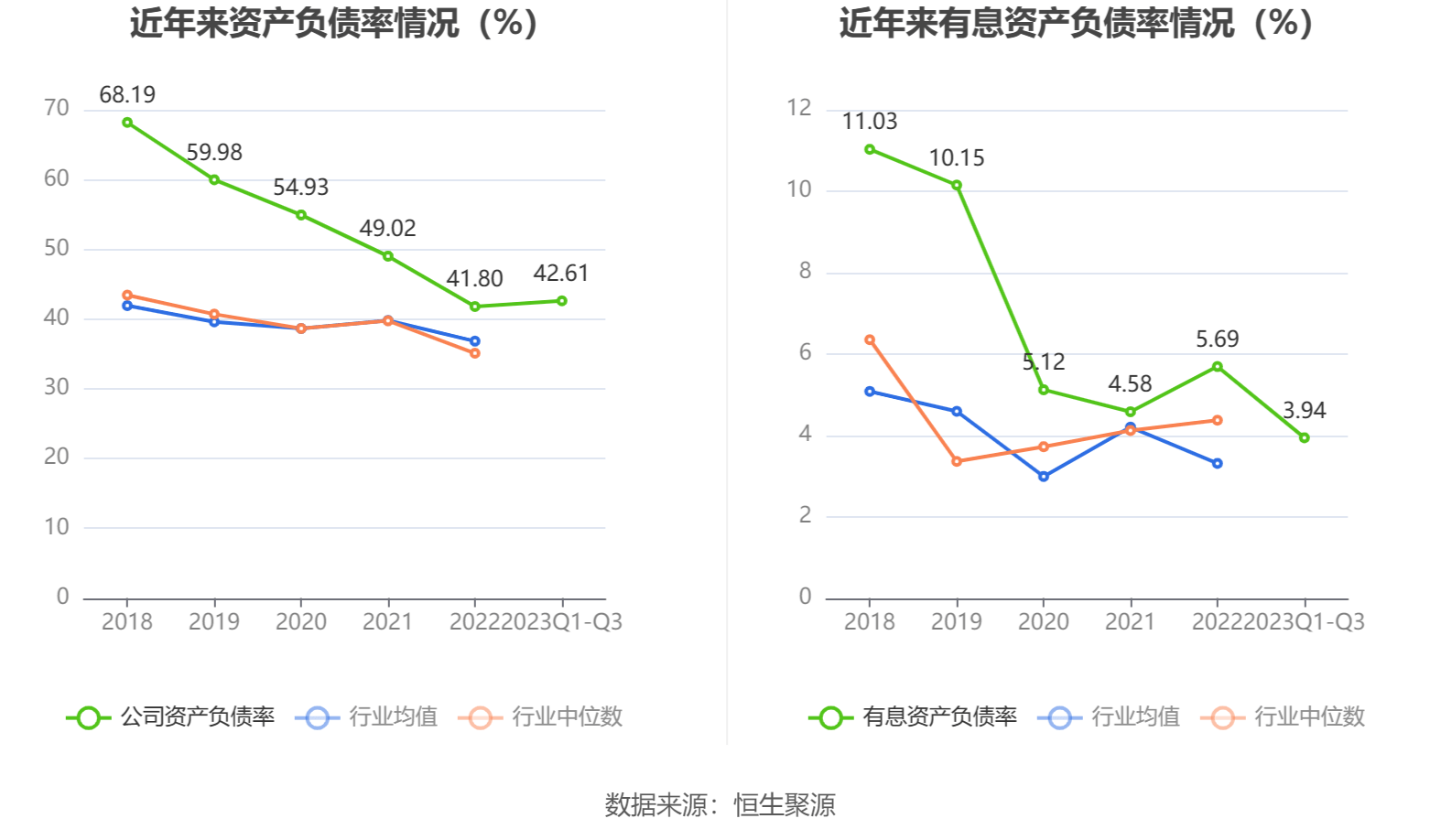 在偿债能力方面,公司2023年三季度末资产负债率为42.61%,相比上年末上升0.81个百分点;有息资产负债率为3.94%,相比上年末下降1.75个百分点。