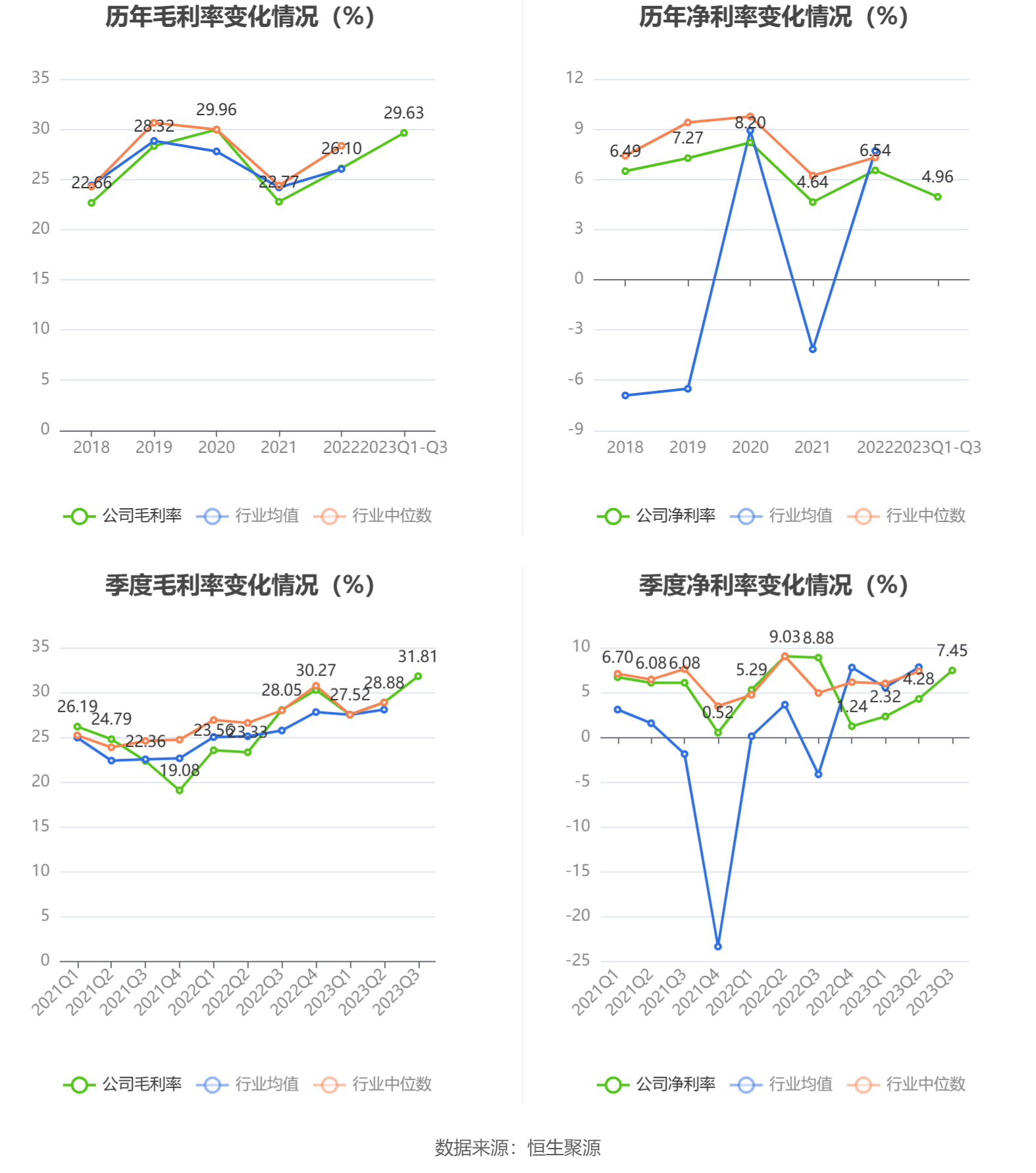 2023年前三季度,公司毛利率为29.63%,同比上升4.57个百分点;净利率为4.96%,较上年同期下降2.91个百分点。从单季度指标来看,2023年第三季度公司毛利率为31.81%,同比上升3.76个百分点,环比上升2.93个百分点;净利率为7.45%,较上年同期下降1.43个百分点,较上一季度上升3.17个百分点。
