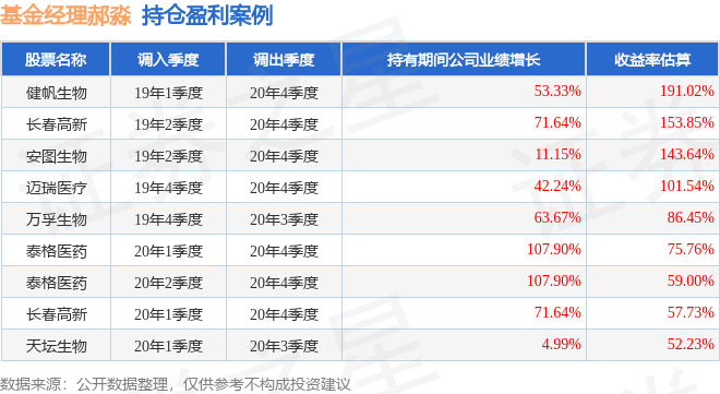 郝淼管理的宝盈医疗健康沪港深股票基金在19年1季度买入健帆生物,在持有1年又3个季度后在20年4季度卖出。持有期间的估算收益率为191.02%,持有期间健帆生物在2019年到2020年的年报归属净利润增幅达53.33%。