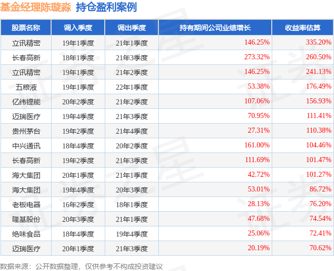 陈璇淼管理的鹏华优势企业基金在19年1季度买入立讯精密,在持有2年又0个季度后在21年1季度卖出。持有期间的估算收益率为335.2%,持有期间立讯精密在2019年到2021年的年报营业总收入增幅达146.25%。