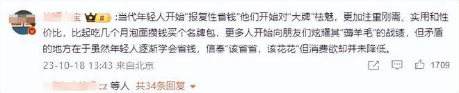 一位北京的网友也表达了自己的看法,反向消费就是对大牌溢价“祛魅”,大家固然追求生活品质,但是断不可能吃几个月泡面去买一个名牌包包,而是寻求折扣,寻找更实惠的渠道消费,讲究“花小钱买大牌”,满足消费欲。
