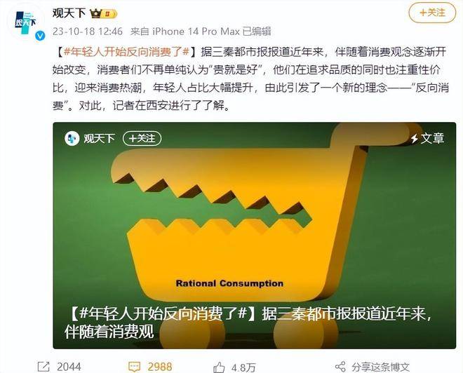 最近,今年被网友们热议的反向消费,再次冲上热搜了,吸引了几千万网友围观。什么是反向消费?反向消费指的一种和以前消费方向相反的消费观念,以前认为品牌就是越贵越好,现在开始重视性价比,变得既追求品质又追求性价比。