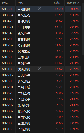 吉翔股份涨停,中文在线、慈文传媒、横店影视、华谊兄弟多股上涨。