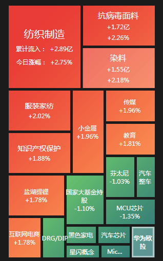 盘面上,纺织制造、文化传媒、小金属、公路铁路运输等板块涨幅居前,星闪概念、汽车整车、芯片、减肥药、黑色家电等板块跌幅居前。