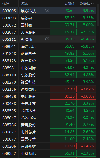 晶方科技跌停,瑞芯微跌超9%,国科微跌8%,中芯国际、蓝箭电子、龙芯中科多股跟跌。