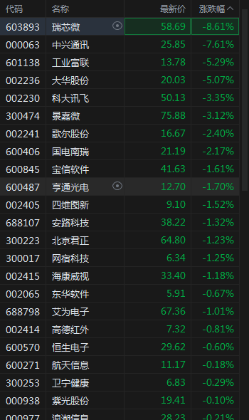 真视通、恒润股份、高新发展一字涨停,瑞芯微跌超8%,工业富联跌超5%,科大讯飞跌超3%。