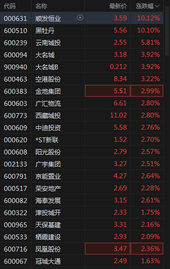 顺发恒业、黑牡丹涨停,金地集团涨约3%,中迪投资涨超2%。