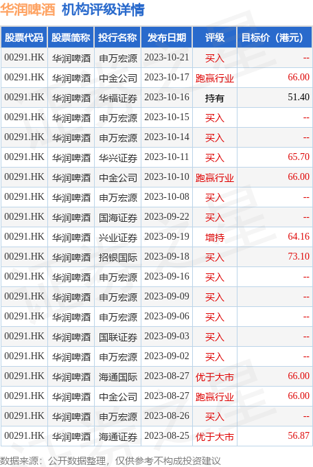 截至2023年10月20日收盘,华润啤酒(00291.HK)报收于41.5港元,下跌1.78%,换手率0.12%,成交量393.73万股,成交额1.65亿港元。投行对该股的评级以买入为主,近90天内共有42家投行给出买入评级,近90天的目标均价为64.42港元。申万宏源最新一份研报给予华润啤酒买入评级。