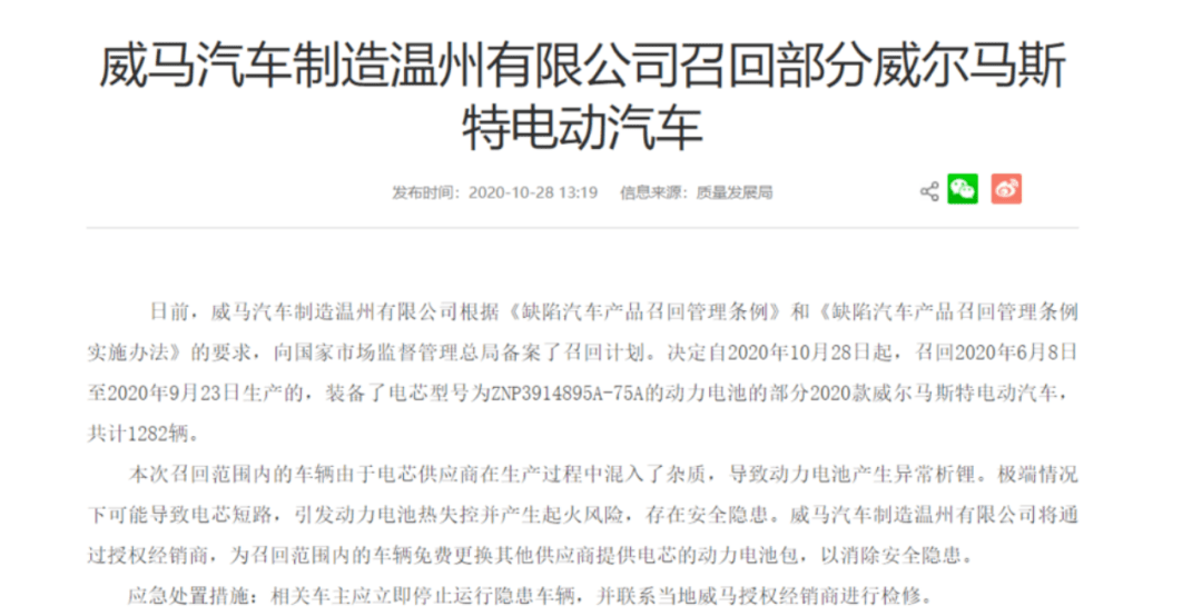 2020年10月28日,威马汽车在其官方渠道发布声明,宣布“主动召回2020年6月8日至2020年9月23日生产,搭载了动力电池型号为ZNP3914895A-75A的部分2020款威马汽车产品,共计1282辆。” 召回原因是由于电芯供应商在生产过程中混入了杂质,导致动力电池产生异常析锂。
