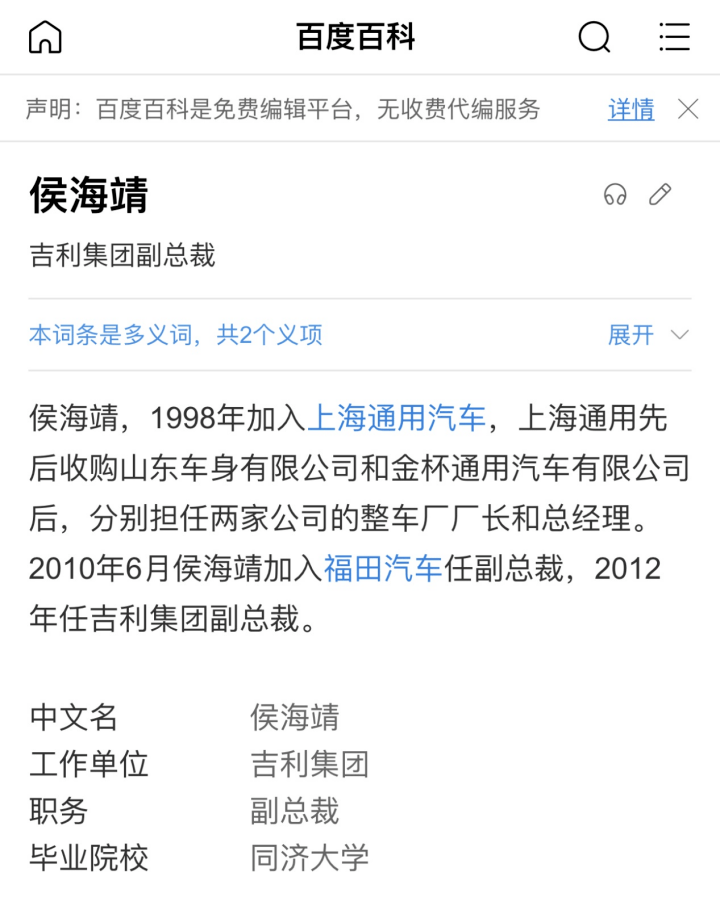 令人瞠目的是,就是这样一位实权派,在百度上搜索侯海靖,几乎找不到他代表威马出席活动的照片和讲话。在百度百科上,侯海靖的简介仍然是吉利集团副总裁,职业履历也终止在了2012年这一栏。