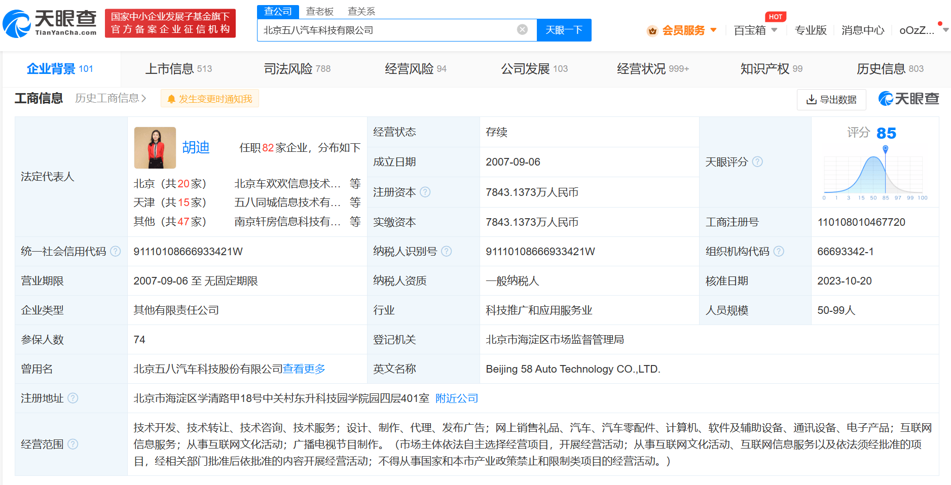 该公司成立于2007年9月,注册资本约7843万人民币,经营范围含技术开发、技术转让、技术咨询、技术服务,网上销售礼品、汽车、汽车零配件、计算机、通讯设备、电子产品,互联网信息服务等。