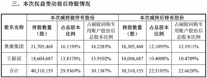 8月24日权益变动公告显示,因自身经营需要,奥康集团、王振滔与康悦齐明签订了《股份转让协议》,转让持有的公司无限售流通股合计1000万股(占剔除公司回购专用账户股份后总股本的7.4767%)。其中,奥康集团拟转让540万股(占剔除公司回购专用账户股份后总股本的4.0374%),王振滔拟转让460万股(占剔除公司回购专用账户股份后总股本的3.4393%)。转让价为54.85元/股,涉及金额5.485亿元。