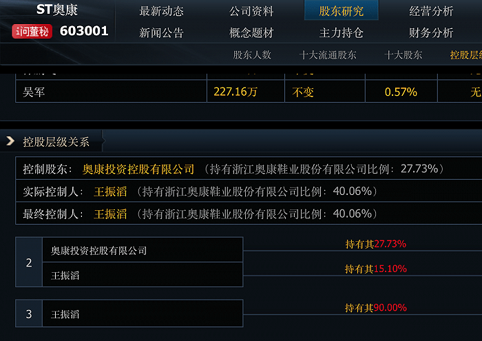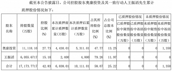 根据ST奥康9月20日的公告,截至公告日,ST奥康控股股东奥康投资及其一致行动人王振滔累计质押了1.01亿股,占其所持有股份比例为58.87%,占总股本比例为25.22%。