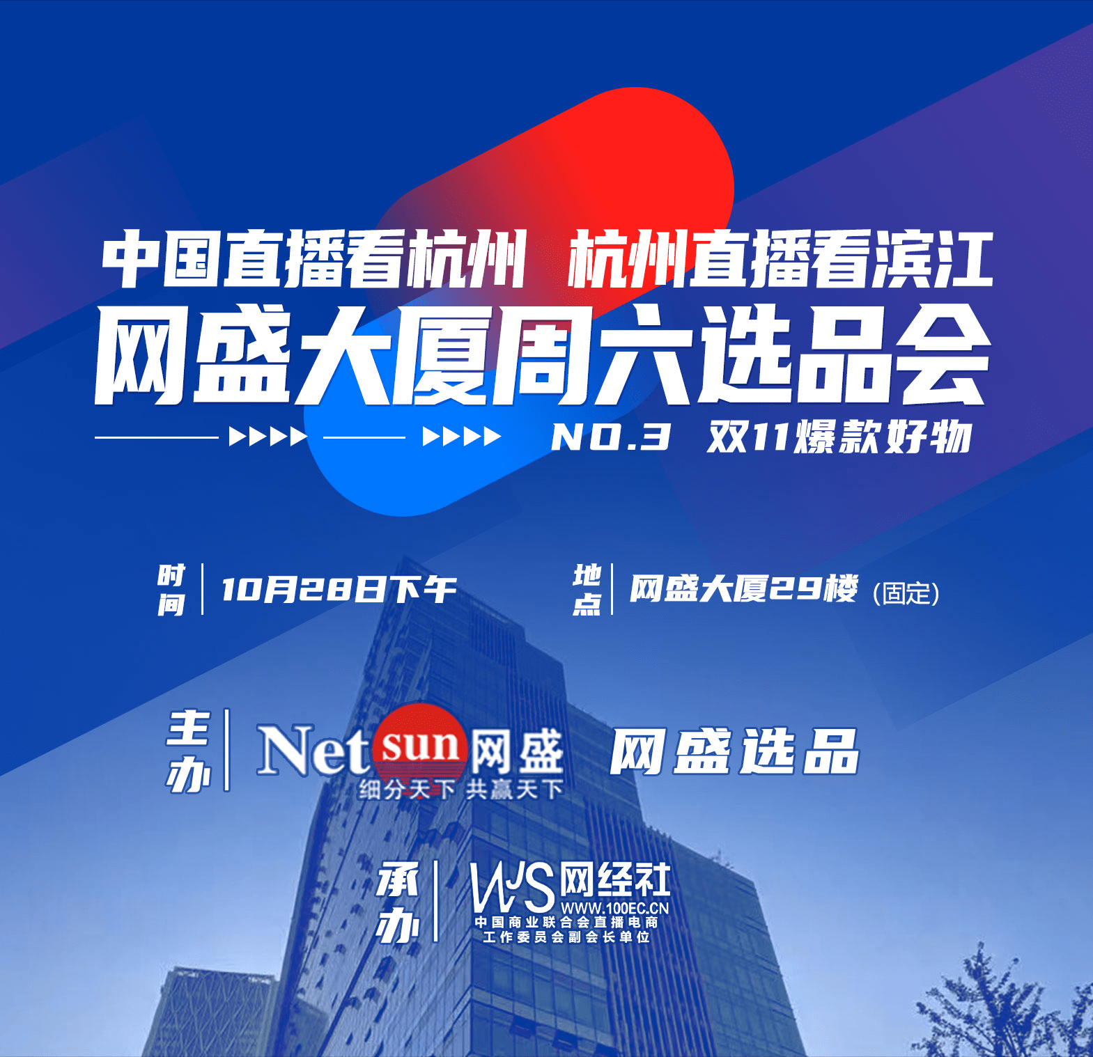 预告:“中国直播看杭州,杭州直播看滨江”。第三期网盛大厦周六选品会(双11爆款好物专场)时间为10月28日,期待您的参与!据悉,网盛大厦周六选品会由浙江网盛生意宝股份有限公司、杭州网盛选品电商服务有限公司主办,浙江网经社信息科技有限公司(中国商业联合会直播电商工作委员会副会长单位)承办。此外,本次选品会也得到了中国商业联合会直播电商工作委员会、杭州市电子商务协会新零售专委会的大力支持。(报名持续开放中,报名通道:http://www.100ec.cn/zt/wszbxpdh/)