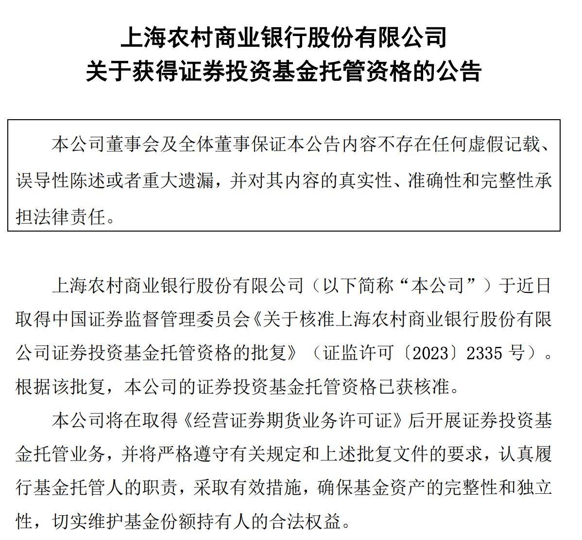 【环球网财经讯】10月24日,据沪农商行公告,该行近日取得《关于核准上海农村商业银行股份有限公司证券投资基金托管资格的批复》(证监许可〔2023〕2335 号)。根据该批复,沪农商行的证券投资基金托管资格已获核准。