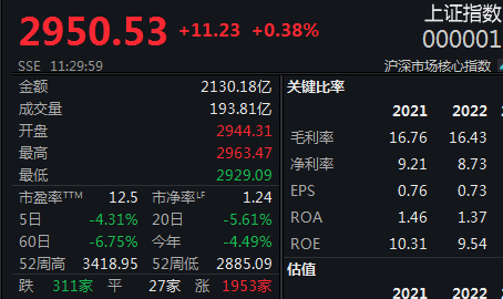 昨日晚间,汇金发布公告称买入交易型开放式指数基金(ETF),并将在未来继续增持。今日,市场略微回暖,个股普涨,截至上午收盘,上证指数午盘涨0.38%,以2950点报收;深成指上涨0.24%,科创板指数涨幅较大,半日涨幅达到1.08%。