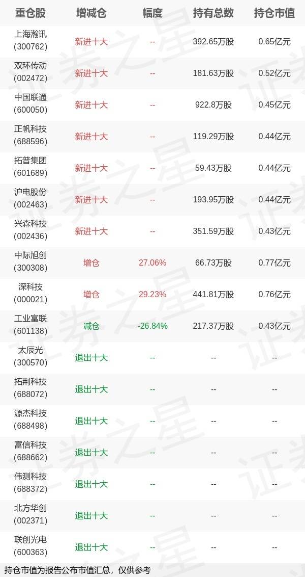 证券之星消息,10月24日交银施罗德基金旗下周珊珊管理的交银施罗德稳固收益债券型基金公布三季报,近1年净值增长率-3.47%。与上一季度相比,该基金前十大重仓股新增上海瀚讯,双环传动,中国联通,正帆科技,拓普集团,沪电股份,兴森科技;并对中际旭创增仓14.21万股,为该基金第一大重仓股;太辰光,拓荆科技,源杰科技,富信科技,伟测科技,北方华创,联创光电等退出前十大重仓股;详细数据如下: