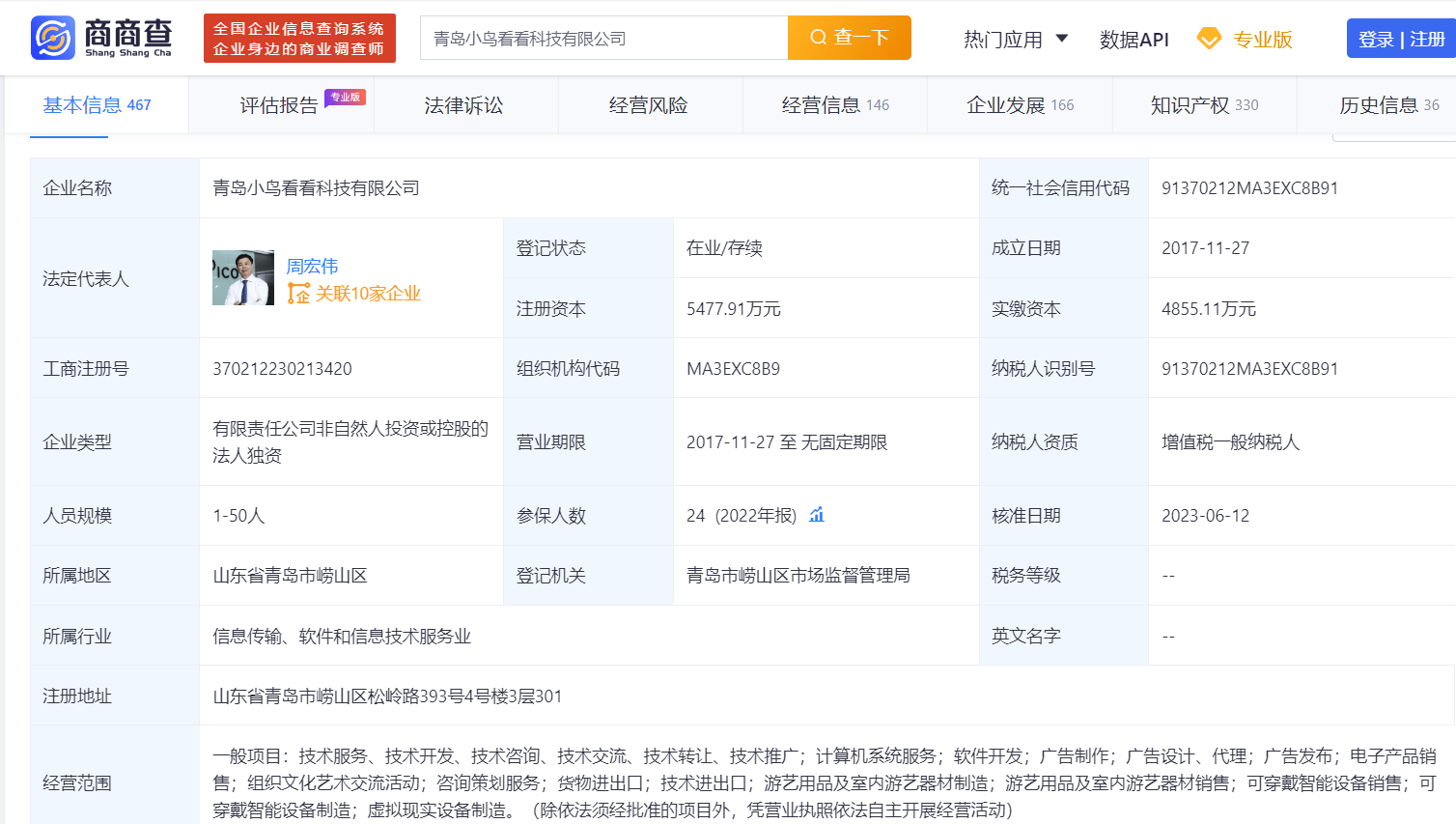 【商商查】显示,PICO所属公司青岛小鸟看看科技有限公司成立于2017年,注册资金5477万元,企业拥有专利325项,但是2021年9月之后就没有更新了。