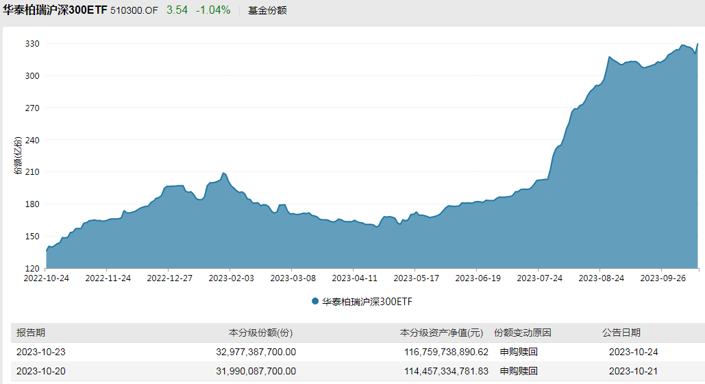 10月23日,在收盘前最后约30分钟,华泰柏瑞沪深300ETF、易方达沪深300ETF等成交量突然放大,大量资金涌入。大智慧数据显示,华泰柏瑞沪深300ETF成交金额为95.92亿元,最后10分钟成交金额超过22亿元。截至10月23日,华泰柏瑞沪深300ETF最新规模为1167.6亿元,最新份额329.77亿份。