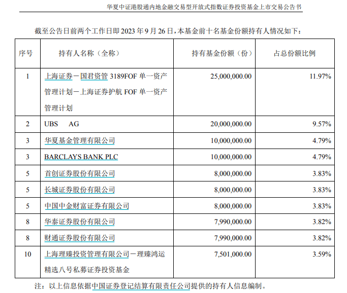 10月11日,华夏中证港股通内地金融ETF正式上市交易。据上市交易公告书,截至9月26日,UBS AG位列其第二大持有人,合计持有份额约2000万份,持有比例达9.57%。Barclays Bank PLC则持有该基金4.79%的份额,与华夏基金并列为第三大持有人。