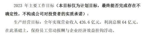 北方稀土在2022年年报中表示,目标2023年全年实现营业收入426.6亿元,利润总额64亿元。