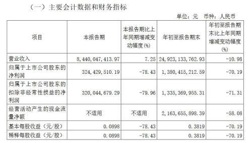 北方稀土公告,前三季度,公司实现营业收入约249.23亿元,同比减少10.98%;利润总额18.61亿元;归属于上市公司股东的净利润约13.80亿元,同比减少70.19%。第三季度,公司实现营业收入约84.40亿元,同比增加7.25%;归属于上市公司股东的净利润约3.24亿元,同比减少78.43%。