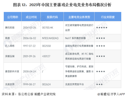 目前,我国电子竞技行业的主要企业包括腾讯控股、网易、巨人网络、英雄互娱(新浪旗下)暴雪软件开发(BLIZZARD)等。其中,腾讯控股旗下的游戏品牌“腾讯游戏”所涉及的电子竞技业务较为广泛,王者荣耀、和平精英等电竞游戏都属于腾讯旗下的电竞游戏。另一个电竞行业巨头网易主要负责NeXT赛事转播。具体的中国游戏企业主要电竞业务布局如下: