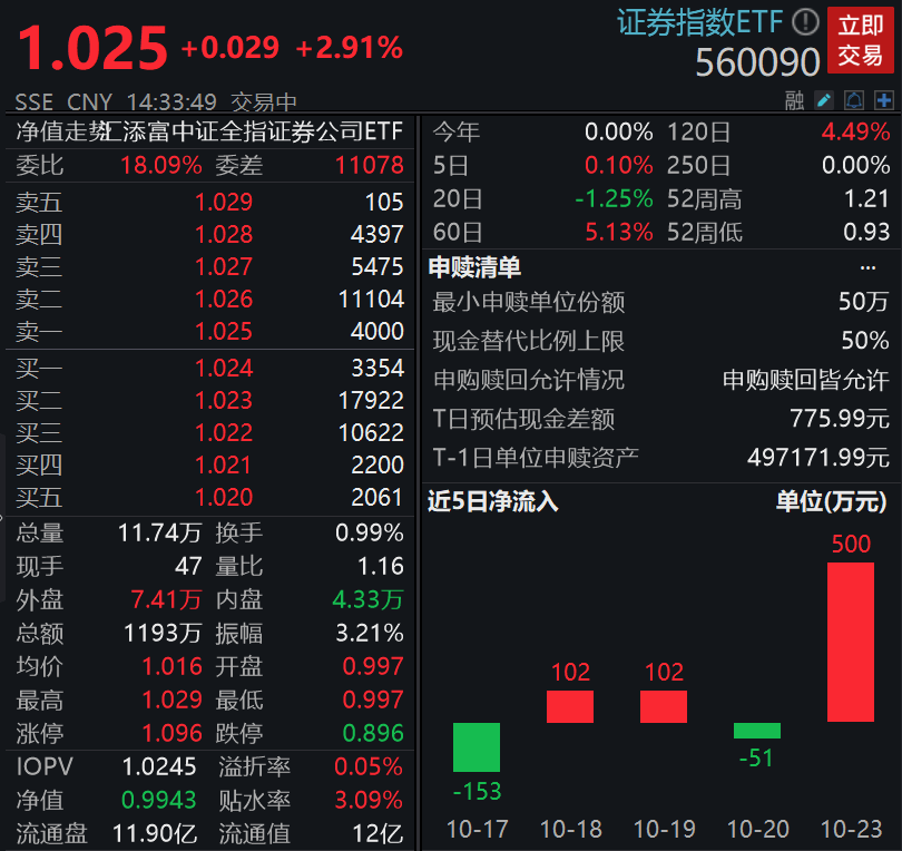 值得注意的是,证券指数ETF(560090)近期资金面强势,近5日有3日获得资金净流入,昨日单日吸金500万元!