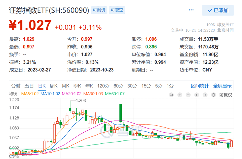 有行情,买证券!热门ETF方面,A股行情风向标——证券指数ETF(560090)大涨超%,盘中强势突破5日、10日和20日线三条均线!