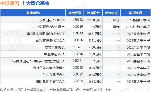 重仓中贝通信的前十大公募基金请见下表: