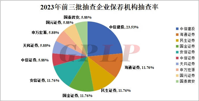 从2023年前三批被抽查企业之保荐机构角度分析,2023年前三批被抽查企业共涉及10家保荐机构。从被抽查项目占比来看,中信建投证券4家,占比23.53%,其次为海通证券、民生证券、国金证券、安信证券,各有2家,占比11.76%,其余的保荐机构均被抽到1家。