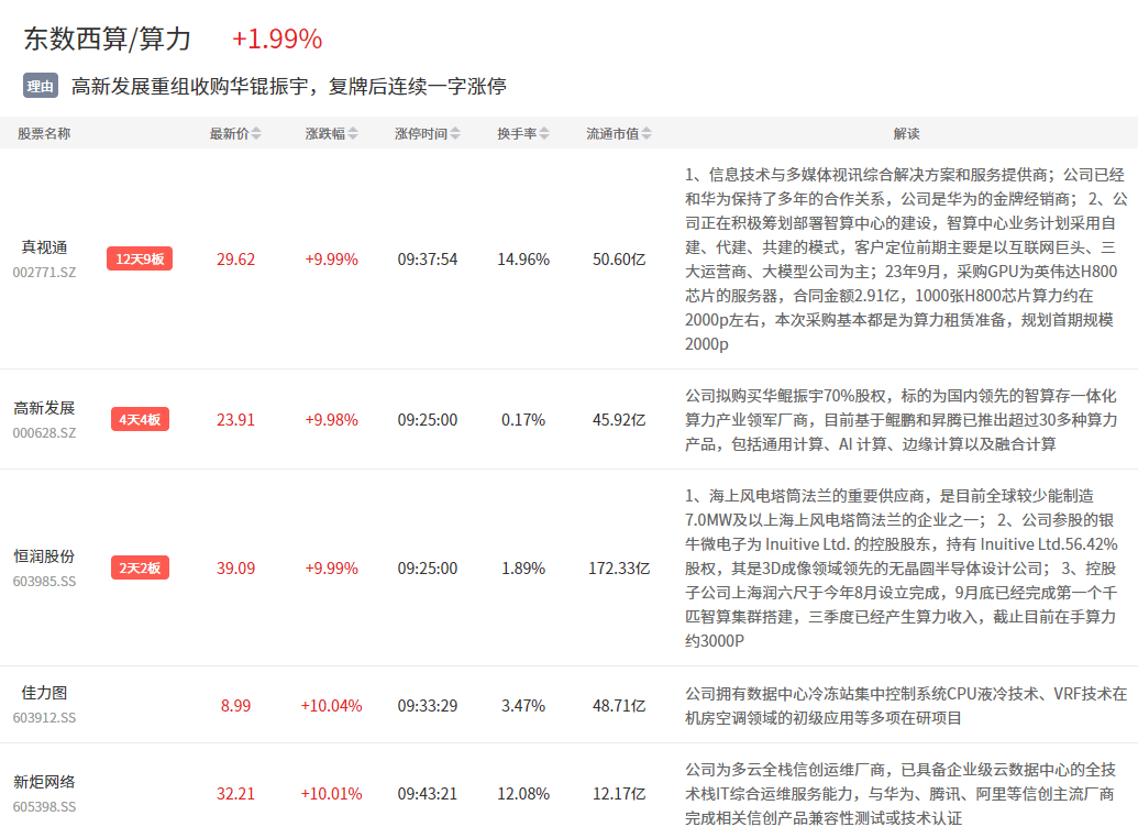 算力板块今日大涨,真视通、高新发展、恒润股份等连板,佳力图、新炬网络等涨停。