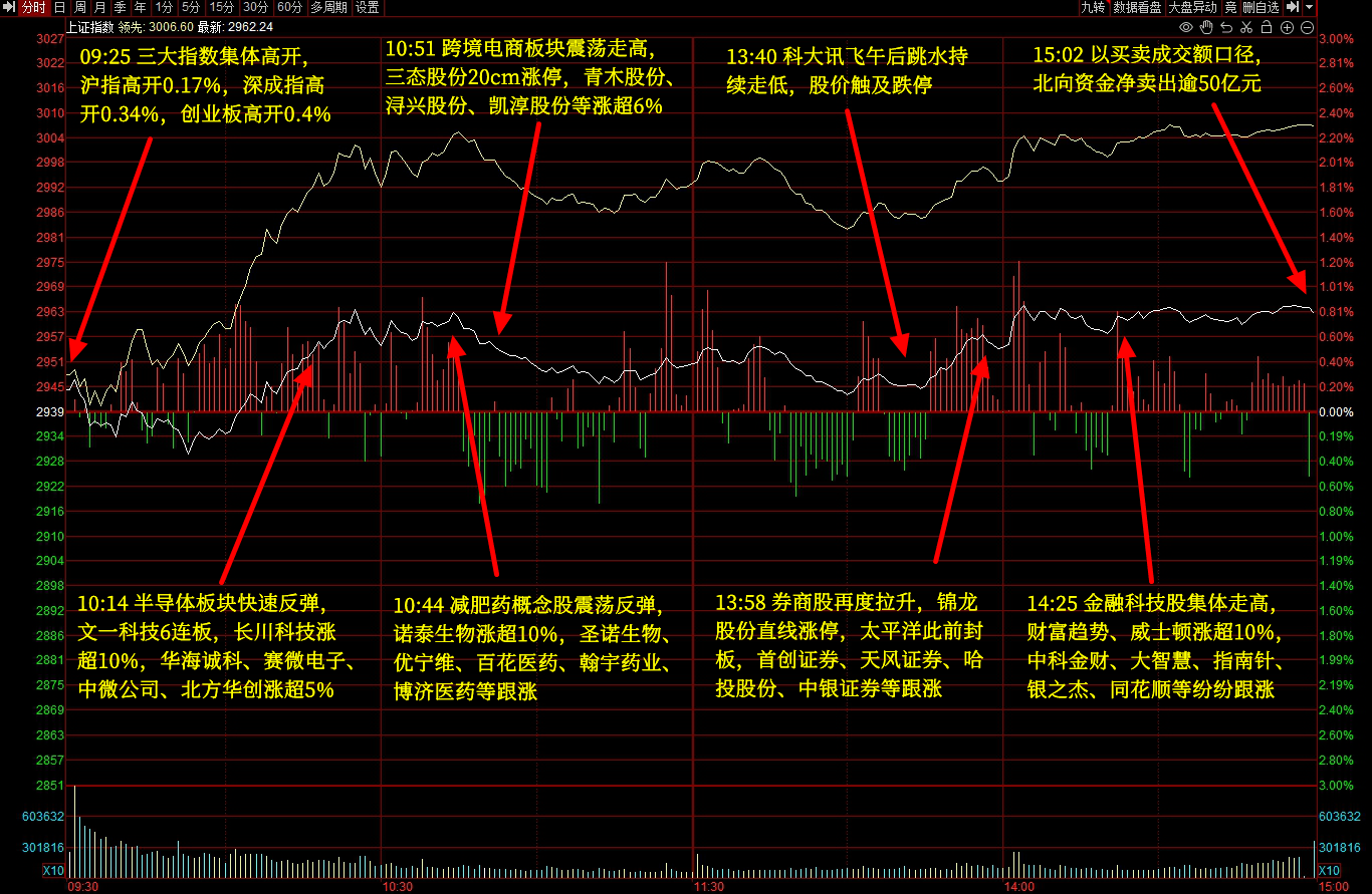 三大指数今日集体反弹,深成指、创业板指盘中涨超1%,黄白二线大幅分化,题材概念表现活跃。券商股午后大涨,天晟新材、锦龙股份、太平洋涨停,华创云信、首创证券、天风证券、中国银河等涨超5%。纺织服装板块走强,梦洁股份、浪莎股份、哈森股份、龙头股份等多股封板。算力概念股反复活跃,真视通7连板,锦鸡股份、恒润股份、佳力图、中贝通信等涨停。卫星导航板块冲高回落,华力创通20cm涨停,龙洲股份3连板,中英科技、三维通信、波导股份等封板。此外高位股走势分化,圣龙股份13连板,真视通7连板,欧菲光跌停,四川长虹跌超5%。个股呈现普涨态势,两市超4500股飘红,今日成交8041亿元。