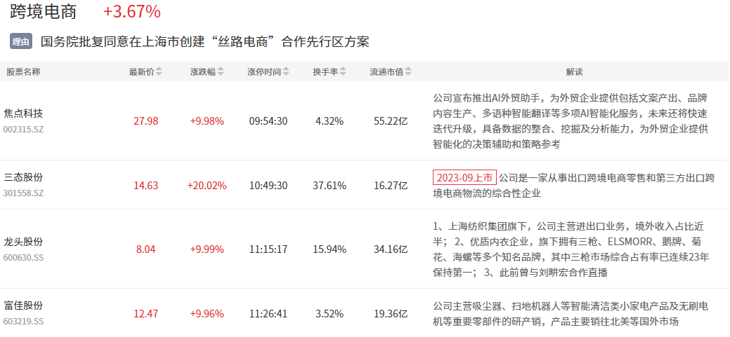 跨境电商概念今日大涨,焦点科技、三态股份、龙头股份等涨停。