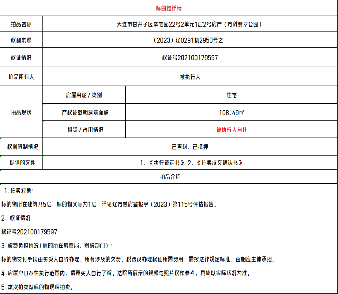 司法拍卖-大连市甘井子区辛宅园22号2单元1层2号房产(万科翡翠公园) 开拍时间:2023年11月29日 房屋用途:住宅 建筑面积:108.49平方米 起拍价格:¥1,583,050