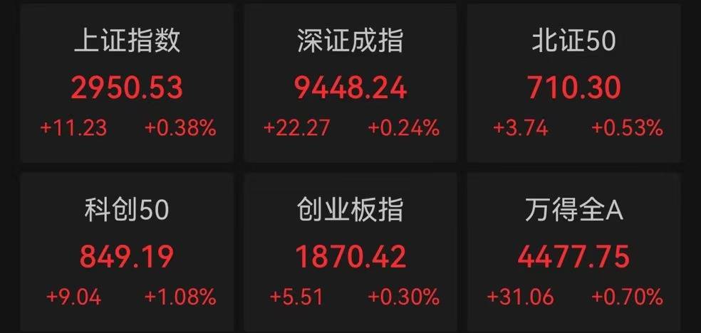 截至午盘,上证指数涨0.38%,报2950.53点;深证成指涨0.24%,报9448.24点;创业板指涨0.30%,报1870.42点。