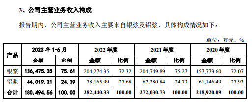 从产品上看,儒兴科技主要拥有银浆、铝浆等两大产品,其中银浆产生的销售收入分别为15.78亿元、20.47亿元、20.43亿元、13.65亿元,分别占当期主营业务收入的72.07%、75.27%、72.32%、75.61%,为公司的第一大产品。