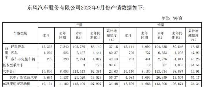 最新销量数据显示,东风集团1-9月累计汽车销量为1,491,259辆,同比下降约20.7%。母公司东风汽车集团有限公司1-9月累计汽车销量为1,683,135辆,同比下降约24.1%。附属公司东风汽车股份有限公司1-9月累计汽车销量为113,634,同比上升约14.9%。