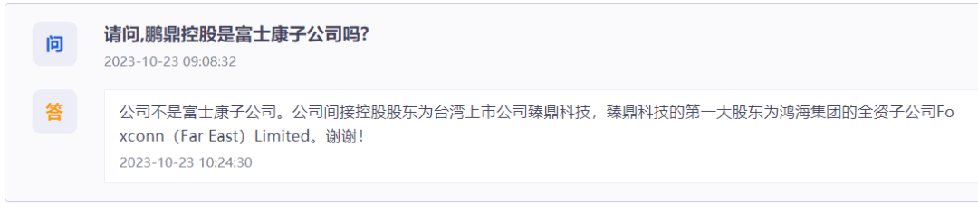 在富士康被调查事件发生后,一些投资者开始关注鹏鼎控股与富士康之间的关系。有人在互动平台上询问鹏鼎控股是否是富士康的子公司。然而,鹏鼎控股对此进行了否认,并表示公司的间接控股股东为台湾上市公司臻鼎科技,而臻鼎科技的第一大股东为鸿海集团的全资子公司Foxconn(Far East)Limited。