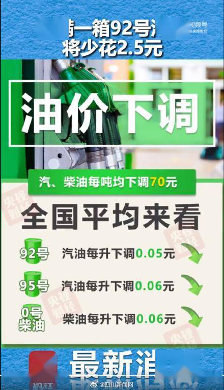 平均来看,伦敦布伦特、纽约WTI油价比上轮调价周期下降2.12%。记者从国家发改委获悉,本次油价调整具体情况如下:国内汽、柴油价格每吨均下调70元。全国平均来看:92号汽油每升下调0.05元;95号汽油每升下调0.06元;0号柴油每升下调0.06元。