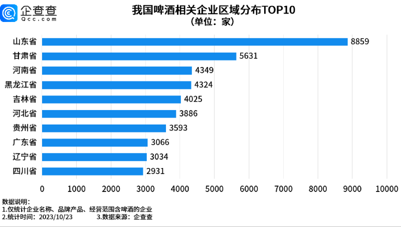 具体数量为:山东现存8859家啤酒相关企业,位居第一;甘肃、河南分别现存5631家、4349家,位居第二、第三;此后是黑龙江、吉林、河北、贵州、广东、辽宁、四川,现存啤酒相关企业数量分别是4324家、4025家、3886家、3593家、3066家、3034家和2931家。