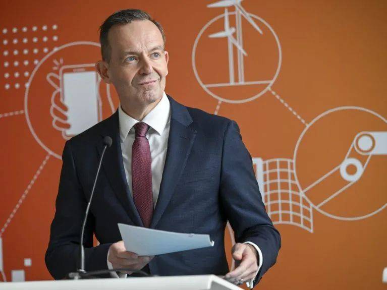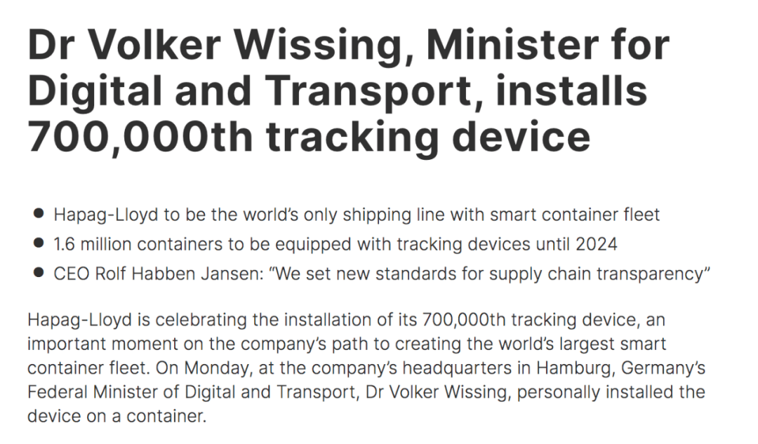 德国数字化和交通部部长Volker Wissing,将第70万个设备安装在赫伯罗特的集装箱上。