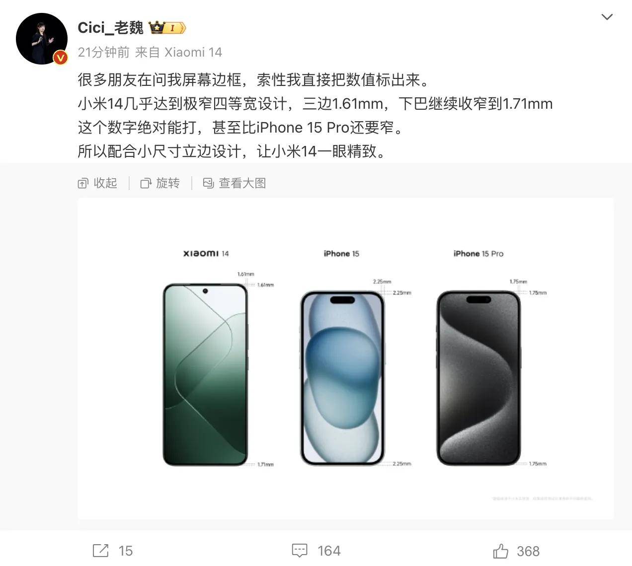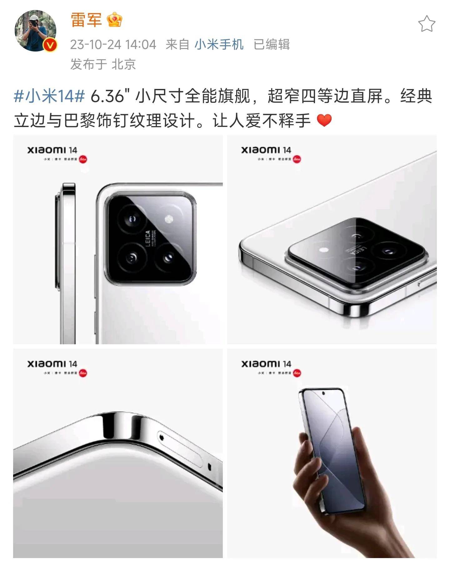 10月24日下午14点04分,雷军突然带着“小米”话题发文表示:6.36" 小尺寸全能旗舰,超窄四等边直屏。经典立边与巴黎饰钉纹理设计。让人爱不释手 。文字的最后,他还特意加上了一个“爱心”符号,喜爱之情可谓是溢于言表。当然,最让人惊喜的,还是文字下面的配图,因为,雷军亲自贴出了小米14定妆照,如此一来,小米14真机,正式被曝光了。