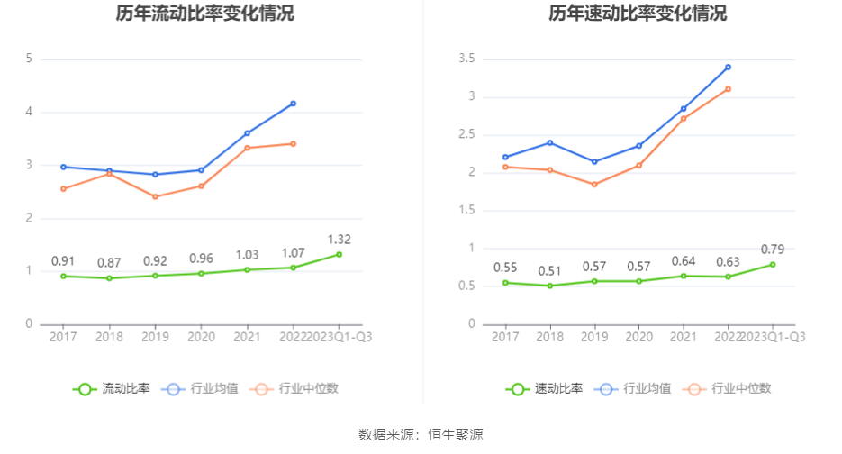 2023年前三季度,公司流动比率为1.32,速动比率为0.79。